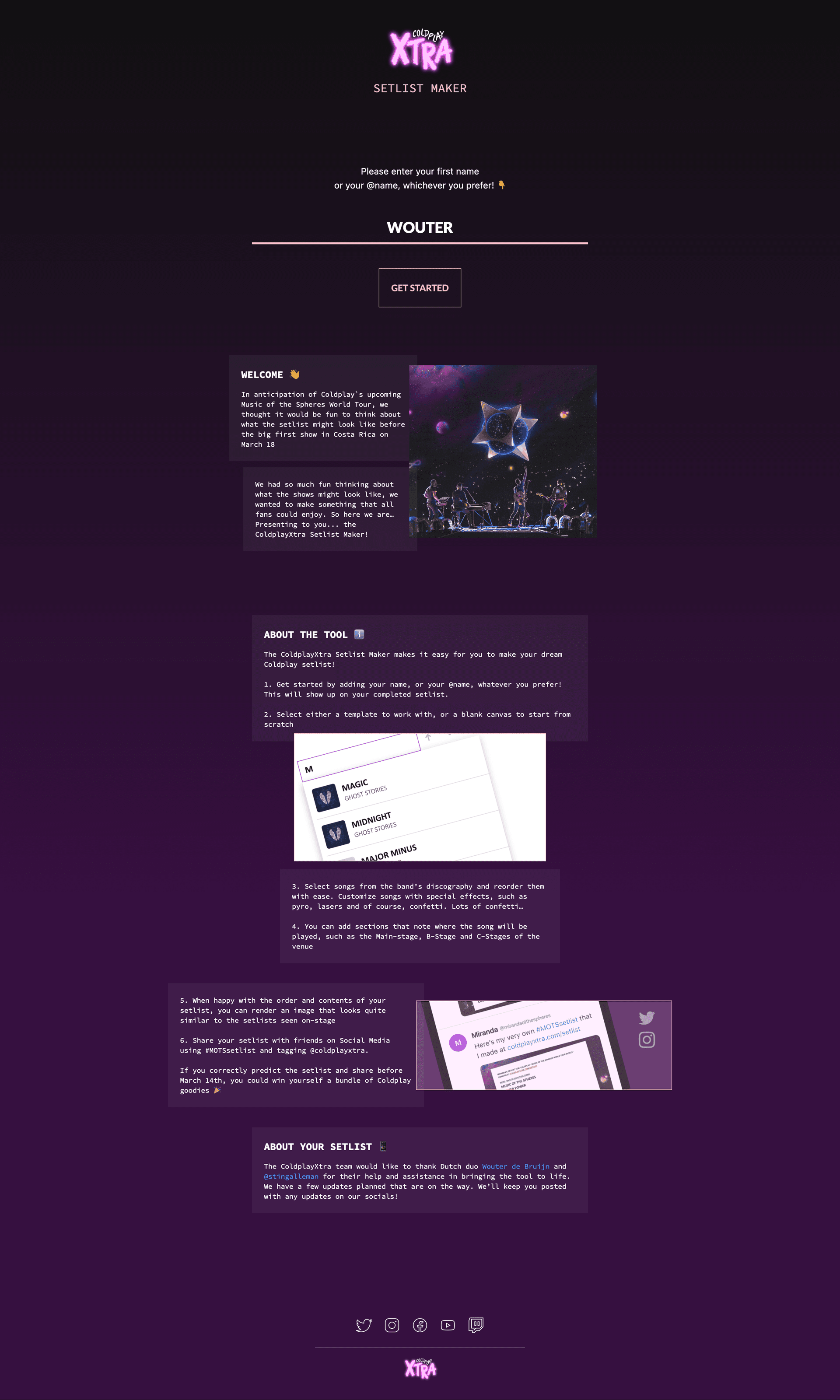 The idea of the project came about when a friend of mine made a custom setlist of what he hoped would be the official setlist coldplay is going to use this year when they are on tour. He realised it was a lot of fun making the setlist and saw an opportunity for a cool webapp. The webapp would be a setlist maker using which you could easily build a personal setlist with some additional features.